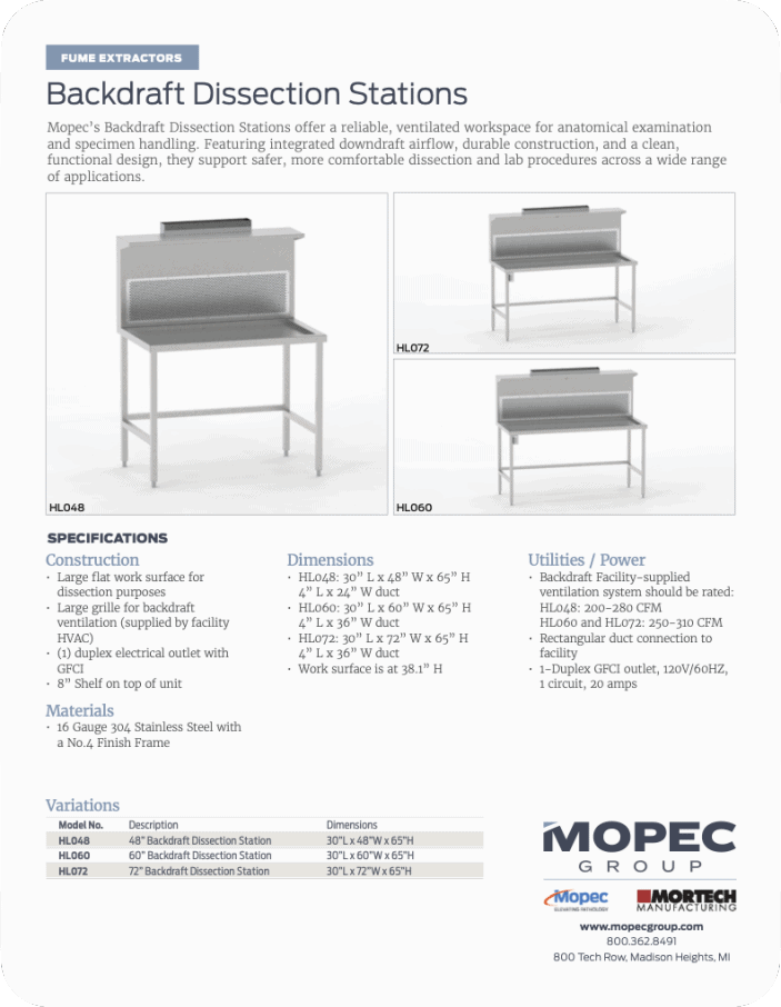 Mopec’s Backdraft Dissection Stations offer a reliable, ventilated workspace for anatomical examination and specimen handling. Featuring integrated downdraft airflow, durable construction, and a clean, functional design, they support safer, more comfortable dissection and lab procedures across a wide range of applications.