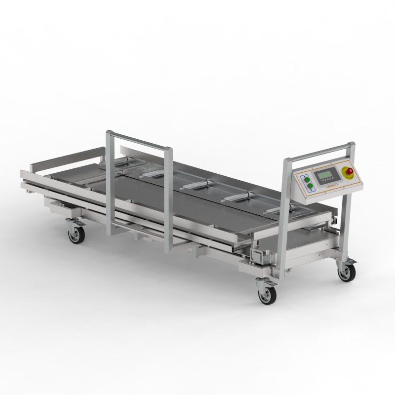 Provides a sturdy, safe, and convenient platform for use in morgue, hospital and research center environments. Features a rugged and robust frame with an adjustable split roller top that allows access from the end. Featuring caster wheels for improved maneuverability and a handle that can be placed on two sides of the lift. A digital scale is integrated into the control console to continuously display the weight value in pounds or kilograms. This allows for a seamless weight measurement directly from the lift system.