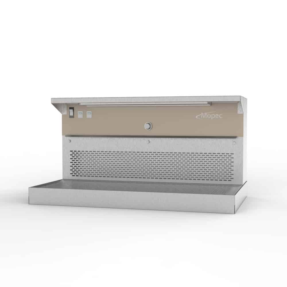 Mopec’s BF400 Workstation is a compact, self-contained countertop dual-draft workstation designed for small labs performing dissection, trimming, and staining procedures. It has a shelf on top with a light beneath it, and an adjustable speed blower system. It comes with potassium permanganate filters, with optional charcoal replacement filters. The front access panel makes the filters easy to replace. The blower system filters the air and recirculates it back into the room. Engineered with all-stainless-steel construction, the BF400 features Mopec’s Dual-draft ventilation system for safe and effective fume removal.