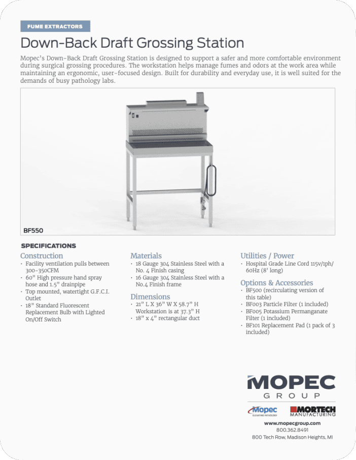 Mopec’s Down-Back Draft Grossing Station is designed to support a safer and more comfortable environment during surgical grossing procedures. The workstation helps manage fumes and odors at the work area while maintaining an ergonomic, user-focused design. Built for durability and everyday use, it is well suited for the demands of busy pathology labs.