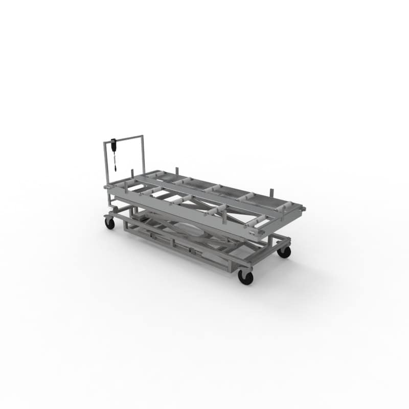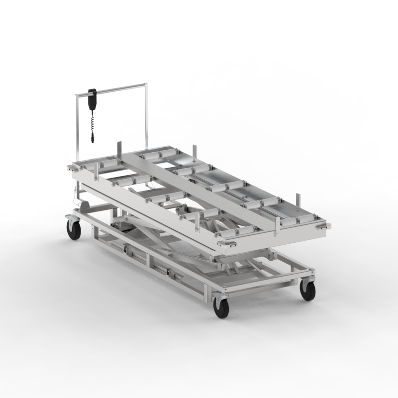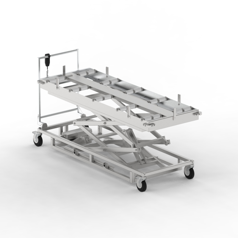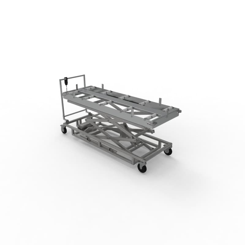 The M690ES Scissor Lifts are a heavy-duty, electromechanical cadaver handling lift designed for mortuary, hospital, and pathology settings. It uses a powered scissor action system with an integral battery charger to eliminate manual lifting, safely raising and lowering body trays up to the height of storage racks. It accommodates body trays and reduces physical strain during transfer and storage tasks.