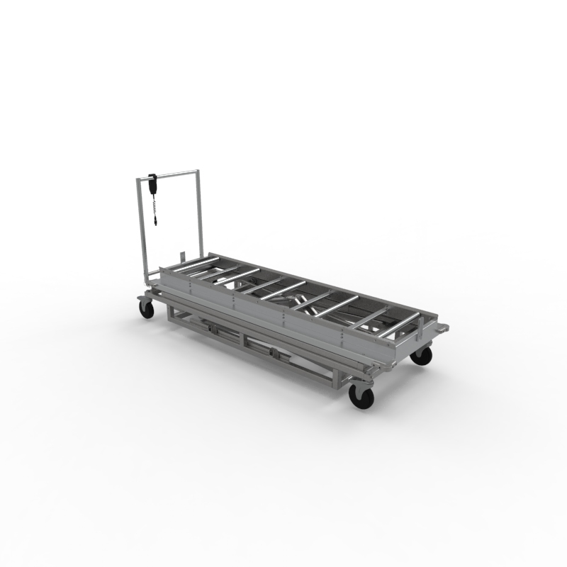 The M690E Scissor Lifts are a heavy-duty, electromechanical cadaver handling lift designed for mortuary, hospital, and pathology settings. It uses a powered scissor action system with an integral battery charger to eliminate manual lifting, safely raising and lowering body trays up to the height of storage racks. It accommodates body trays and reduces physical strain during transfer and storage tasks.
