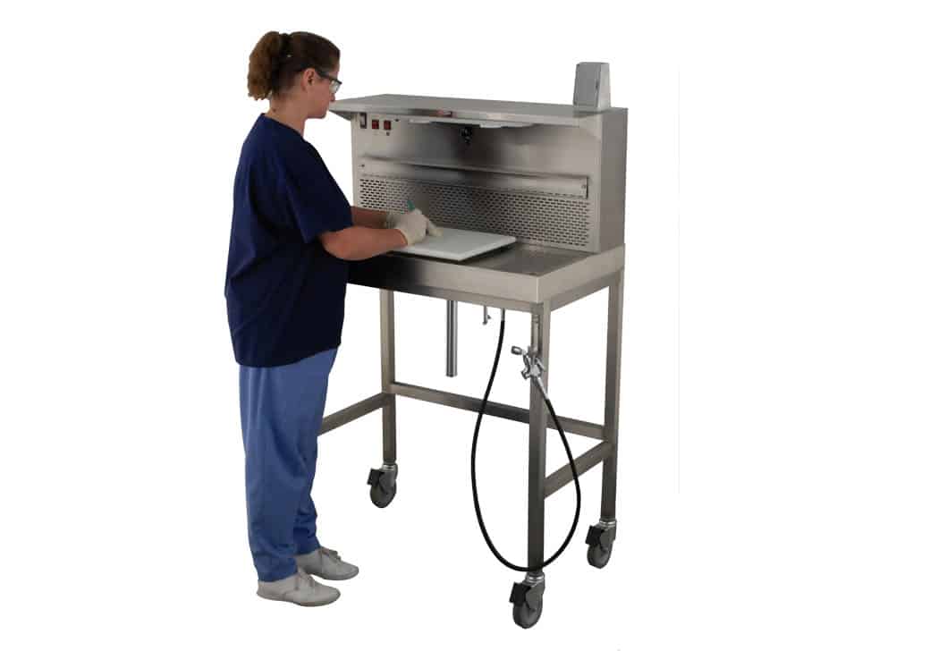 The Portable trimming station allows for conveniently moving the table while efficiently trimming during necropsy.