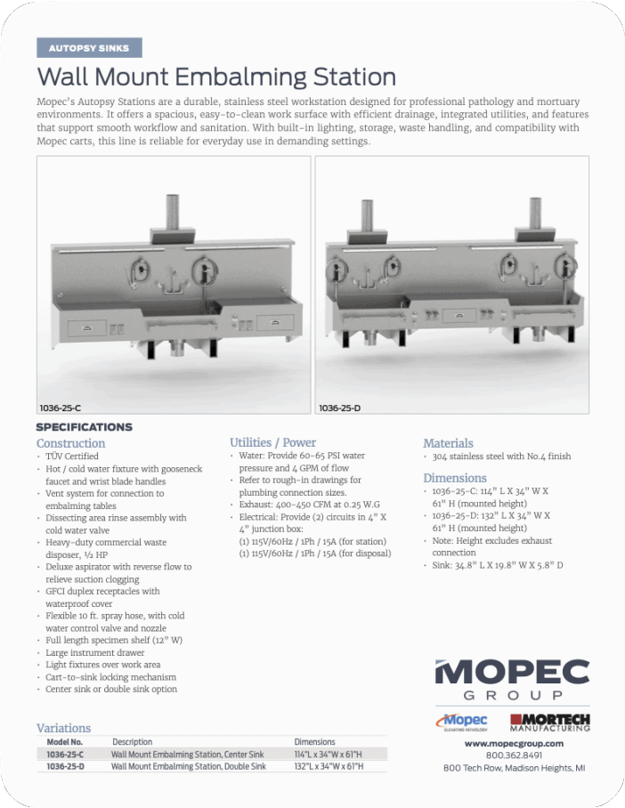 Mopec’s Autopsy Stations are a durable, stainless steel workstation designed for professional pathology and mortuary environments. It offers a spacious, easy-to-clean work surface with efficient drainage, integrated utilities, and features that support smooth workflow and sanitation. With built-in lighting, storage, waste handling, and compatibility with Mopec carts, this line is reliable for everyday use in demanding settings.
